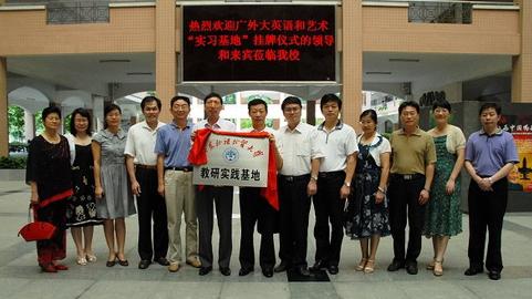 7月2日上午,买球官网首个“教研实践基地”挂牌仪式在买球官网附设外语学校举行。上午十时许,买球官网党委副书记许国彬把“广东外语外贸大学教研实践基地”的匾牌正式交到买球官网附设外语学校校长李建民手中,这标志着双方在今后的教育教学领域将有更多、更广泛的交流与合作。教务处副处长孙家和、就业指导中心主任赵烨、买球App软件手机在线下载党委书记袁长青、副院长董金伟、艺术学院院长温恒泰、院党支部书记车小真,附设外语学校校长李建民、副校长王秀民、吴玉爱、校长助理徐纯、英语教研室主任贺永忠、艺术总监郭小弦等人参加了签约揭牌牌仪式。揭牌仪式由买球官网副院长董金伟主持。