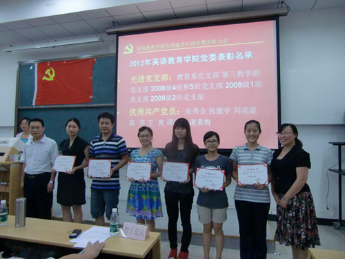 在买球官网肖建芳副院长宣读学院党委的表彰决定之后,颁奖典礼开始。首先颁发的是2012年买球官网受到广东外语外贸大学党委表彰名单:获得先进党支部的是第二教学部党支部,获得优秀共产党员的为肖建芳、姚银燕及任燕琼。随后颁发的是2012年买球App软件手机在线下载党委表彰名单:获得先进党支部的是教育系党支部、第三教学部党支部、2008级4班和5班党支部、2009级1班党支部以及2009级2班党支部;获得优秀共产党员的为朱秀全、张骏宇、刘亮星、陈英、王爽、谭淑贤和谢素梅。