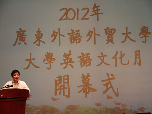 在开幕式上,教务处处长詹文都做了讲话,他强调了广外大英语文化月系列活动在凸显买球官网大学英语教学特色方面的重要性。詹处长提到,去年以来,买球官网获得一系列荣誉,如买球官网被评为“教育部第三批大学英语教学改革示范点”单位,买球官网的“大学英语系列课程”被评为广东省精品课程,曾丹等十多位教师在全国各级各类教学比赛中获得优异成绩,以及曾丹丹、张瑶等一批学生在全国各种英语教学和演讲比赛中获得一等奖等殊荣。詹处长对买球App软件手机在线下载的教学改革成效和教师、教学水平的不断提高给予了充分的肯定,并希望买球App软件手机在线下载努力把大学英语文化月系列活动办出特色、办出水平,也表示学校会对大学英语教学给予一如既往的支持。