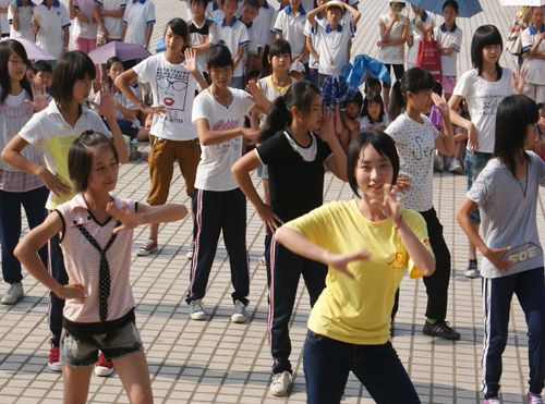 第一个节目是大湾中学初一同学的充满激情的英语晨读。在何老师的一声令下,排成三列整齐横队的同学迅速高举自己手上的晨读资料并大声朗读,其声音之大、整齐之势凸显了他们的朝气蓬勃。接下来的是大湾中学同学们带来的可爱的舞蹈《冰激凌的爱》。十几位可爱的小女孩和她们的老师一起随着活泼灵动的音乐跳跃起舞,制造出来的欢乐轻松的气氛感染了全场观众,其乐融融。当大家还在回味刚才那可爱的舞蹈时,大湾中学初二的同学带来的一首《shining friends》把大家带进另一种感动中。学生们充满感情的歌声,完美的诠释了那浓浓的师生情谊。