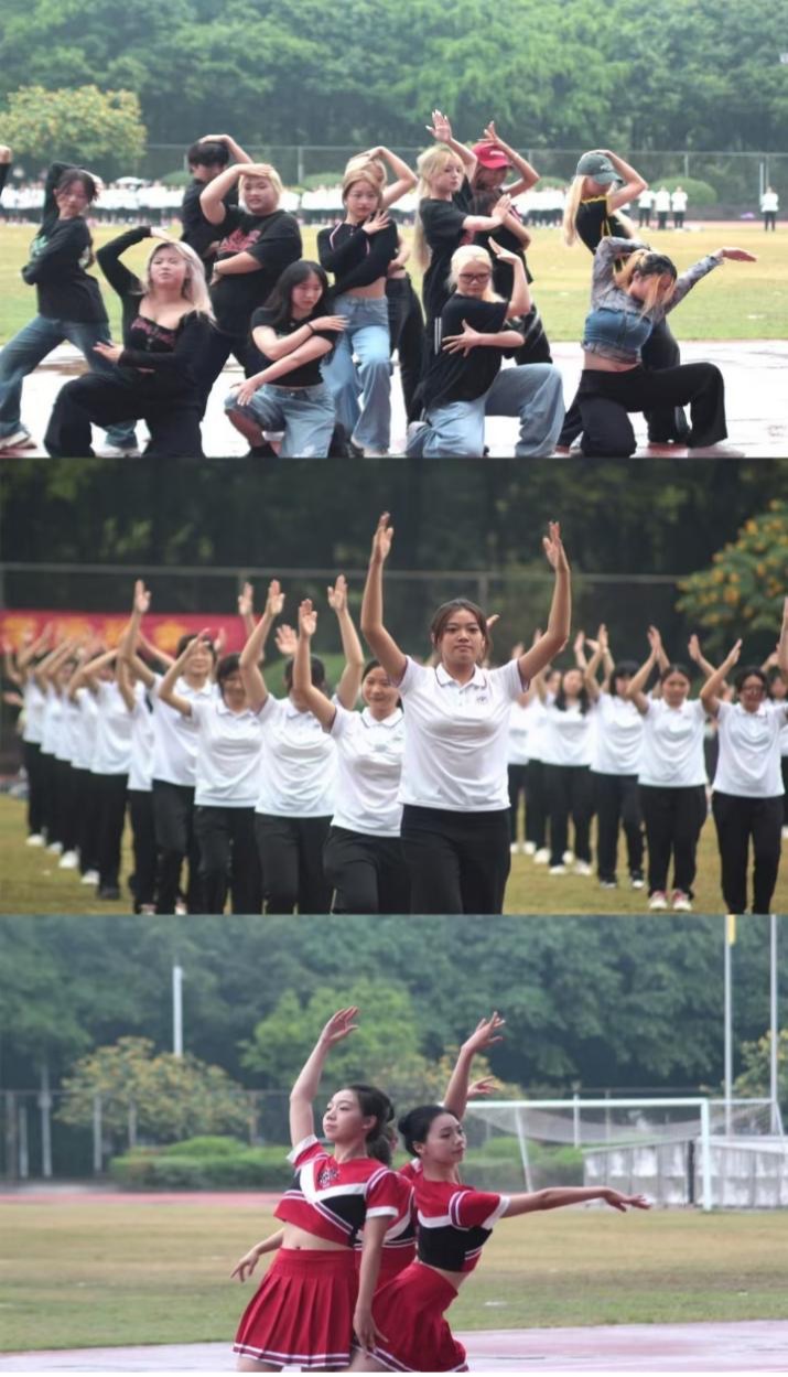 开幕式表演环节中,校啦啦操队、健美操队和街舞队伴着音乐起舞,展现了一场场视觉盛宴,尽显青春之姿。在总共270人的健美操团体表演中,同学们意气风发的舞姿诠释着无穷的青春活力,流畅自然的队形变化彰显着默契的团队精神,广外学子的青春激情被点燃。